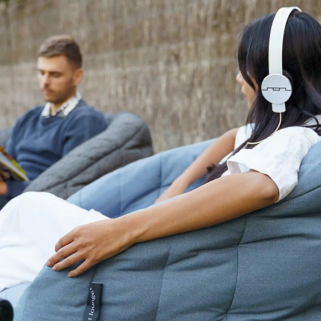 En vakker designer utendørs bean bag-stol fra Ambient Lounge® - laget med kjærlighet med en drømmende kjølig-blå tone, elastisk struktur, taktilt quilting og resort-kvalitet stil.